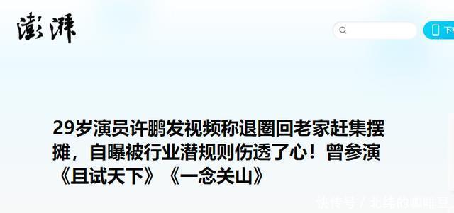 就这样没背景、没资源的他经历了人生最黑暗的一段时间,他不愿意为不良势力所低头。 彻底对娱乐圈心灰意冷,果断的退出了娱乐圈,现在许鹏开启互联网记录自己生活的模式。 不仅是潜规则,将某些公司为赚钱所用的一些不良手段。突然想到何老师曾经在节目里说过。